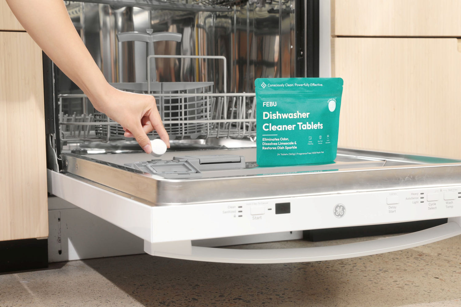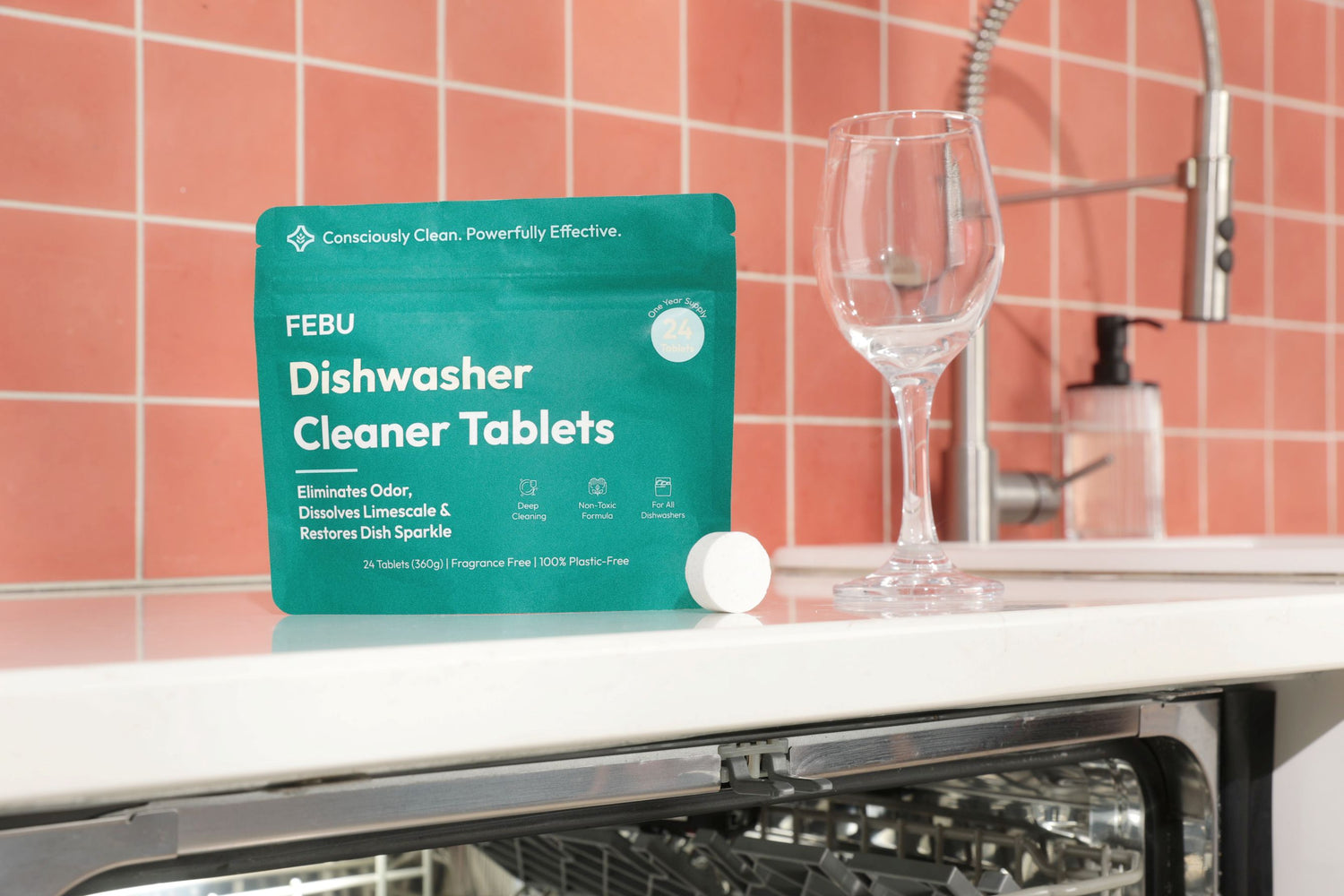 FEBU tablets penetrate and dissolve hidden grime, grease, and hard water build-up, resotring your dishwasher's performance for a visibly spotless shine on every dish. It's the essential reset for a fresh, clean machine.